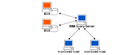 Relationship between DGEs, WMI Query Server, and monitored hostsThe NetVigil WMI Query Server Configuration FileAfter the NetVigil WMI Query Server is installed, either on a stand-alone server to be used with DGE on a Linux/Solaris server, or as part of the DGE on a Windows server, you can fine-tune it's configuration. The table below lists the configurable parameters in the configuration file